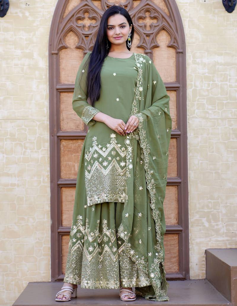 Green Festive Wear Designer Fox Georgette Sequence Embroidery Work Readymade Suit Stitched