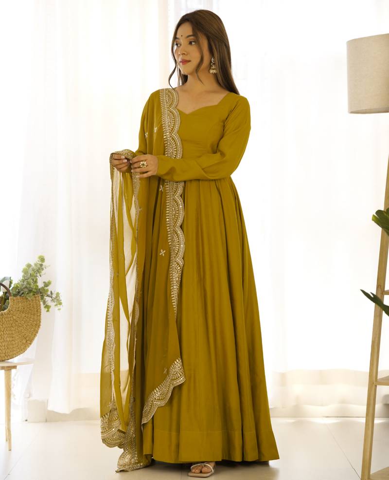 • Product Id : 4760115 • Package Details : 1 Top/1 Dupatta • Type : Readymade Suits For Women • Look : Traditional • Sleeve : Full Sleeve • Fabric : Chiffon • Color : Mustard • Work : Work • Stitching : Stitched General - Color and Texture may have slight variation. This happens because of photography.