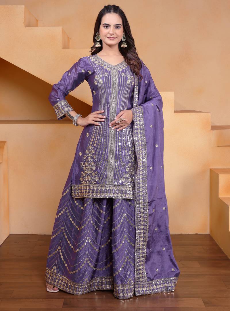 Lavender Festive Wear Designer Chinon Readymade Suit Stitched