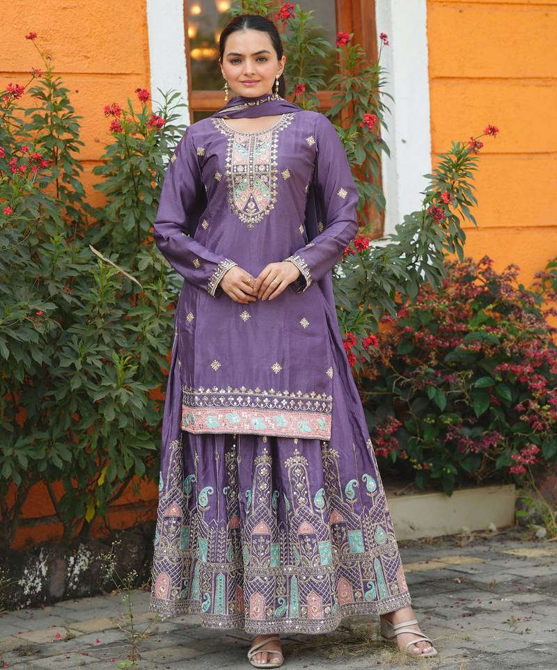 Lavender Festive Wear Designer Chinon Sequence Embroidery Work Readymade Suit Stitched