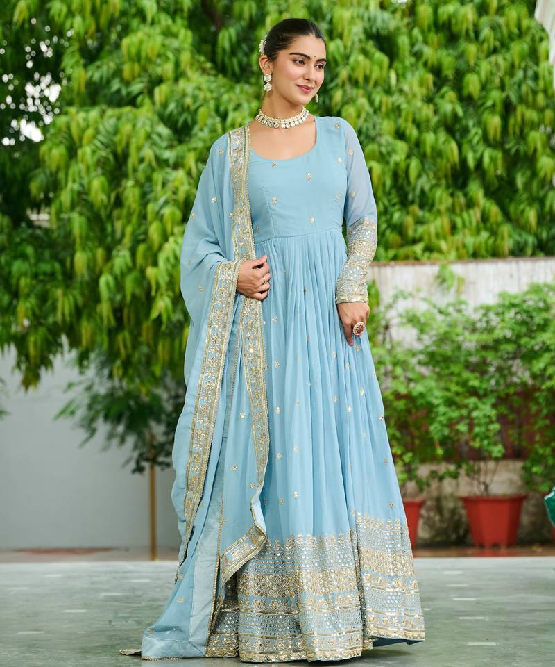 • Product Id : 4760351 • Package Details : 1 Top/1 Dupatta • Type : Readymade Suits For Women • Look : Traditional • Sleeve : Full Sleeve • Color : Sky Blue • Fabric : Faux Georgette • Work : Work • Stitching : Stitched General - Color and Texture may have slight variation. This happens because of photography.