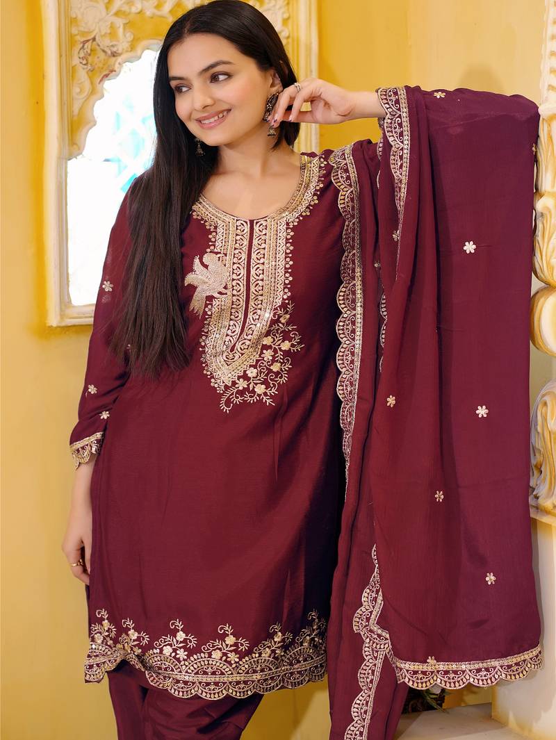 Maroon Festive Wear Designer Chinon Readymade Suit Stitched