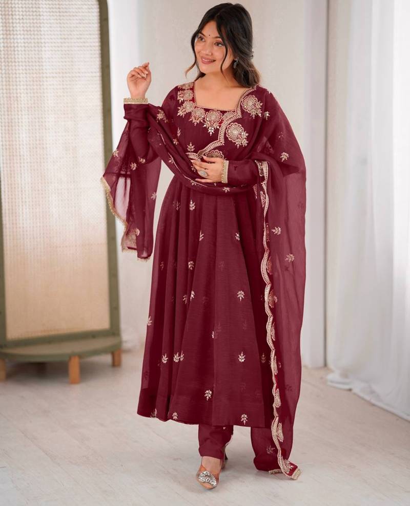 Maroon Festive Wear Designer Crunchy Silk Embroidery Sequence Work Readymade Suit Stitched