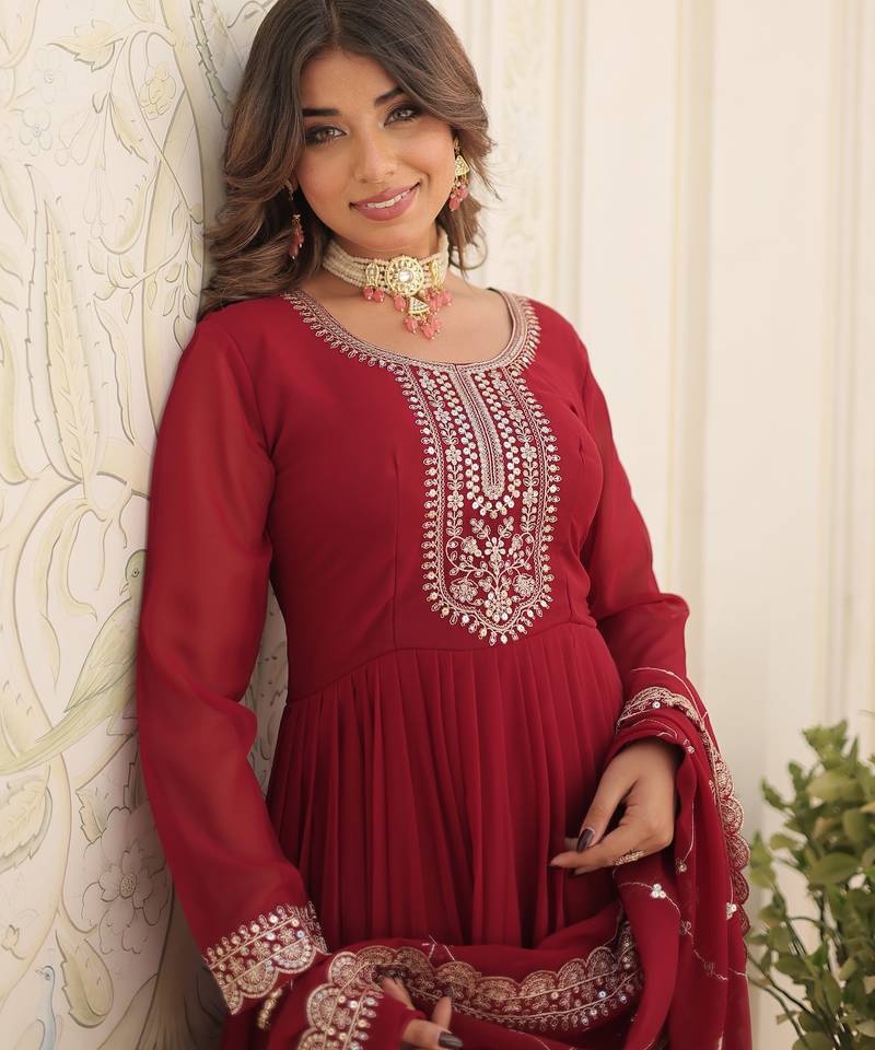 Maroon Festive Wear Designer Faux Blooming Georgette Embroidered & Sequins Work Readymade Suit Stitched