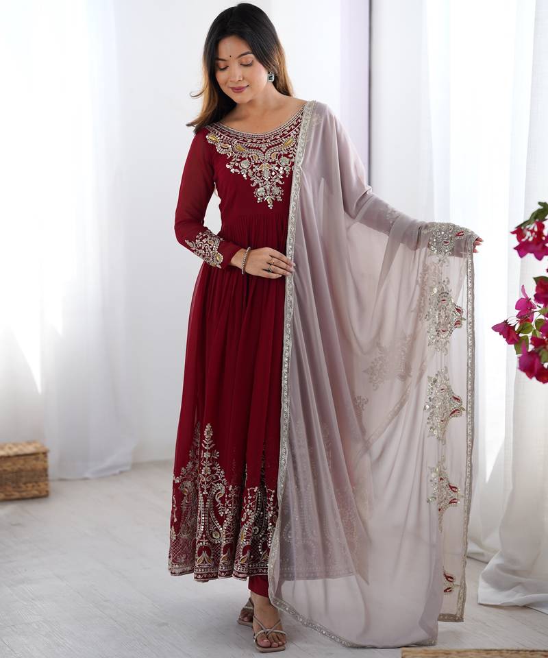 Maroon Festive Wear Designer Heavy Georgette Multi Thread Heavy 5mm Embroidery Sequence Work Readymade Suit Stitched