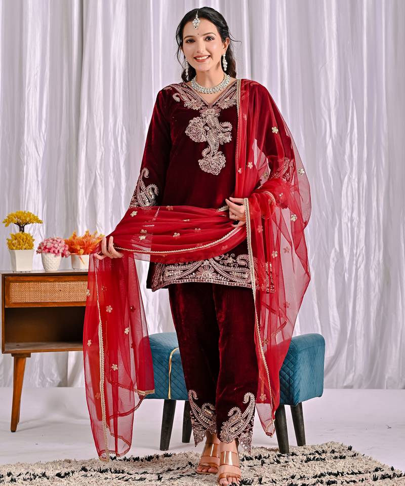 • Product Id : 4760446 • Package Details : 1 Top/1 Bottom/1 Dupatta • Type : Readymade Suits For Women • Look : Traditional • Sleeve : Full Sleeve • Fabric : Velvet • Color : Maroon • Work : Work • Stitching : Stitched General - Color and Texture may have slight variation. This happens because of photography.