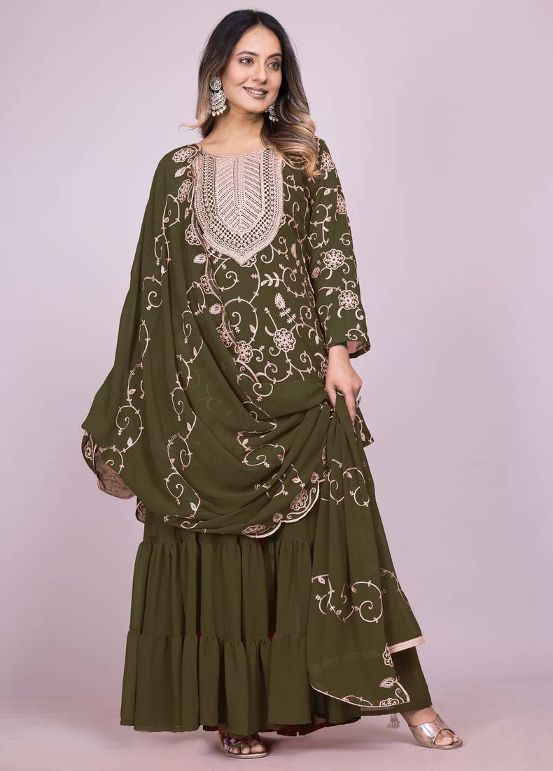 Mehendi Green Festive Wear Designer Fox Georgette Embroidered Work Readymade Suit Stitched