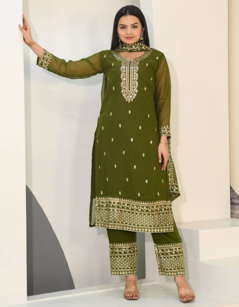 Mehndi Green Festive Wear Designer Fox Georgette Heavy Embroidery Sequence Work Readymade Suit Stitched