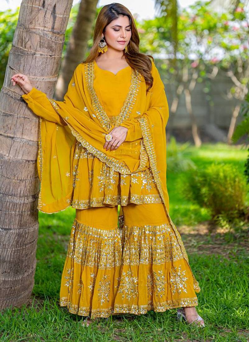• Product Id : 4760227 • Package Details : 1 Top/1 Bottom/1 Dupatta • Type : Readymade Suits For Women • Look : Traditional • Sleeve : Full Sleeve • Fabric : Georgette • Color : Mustard • Work : Work • Stitching : Stitched General - Color and Texture may have slight variation. This happens because of photography.