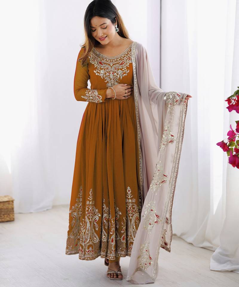 Mustard Festive Wear Designer Heavy Georgette Multi Thread Heavy 5mm Embroidery Sequence Work Readymade Suit Stitched