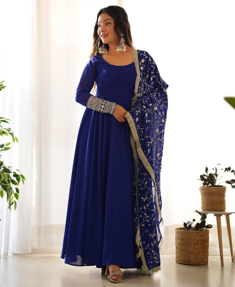 • Product Id : 4760110 • Package Details : 1 Top/1 Bottom/1 Dupatta • Type : Readymade Suits For Women • Look : Traditional • Sleeve : Full Sleeve • Fabric : Georgette • Color : Navy Blue • Work : Work • Stitching : Stitched General - Color and Texture may have slight variation. This happens because of photography.
