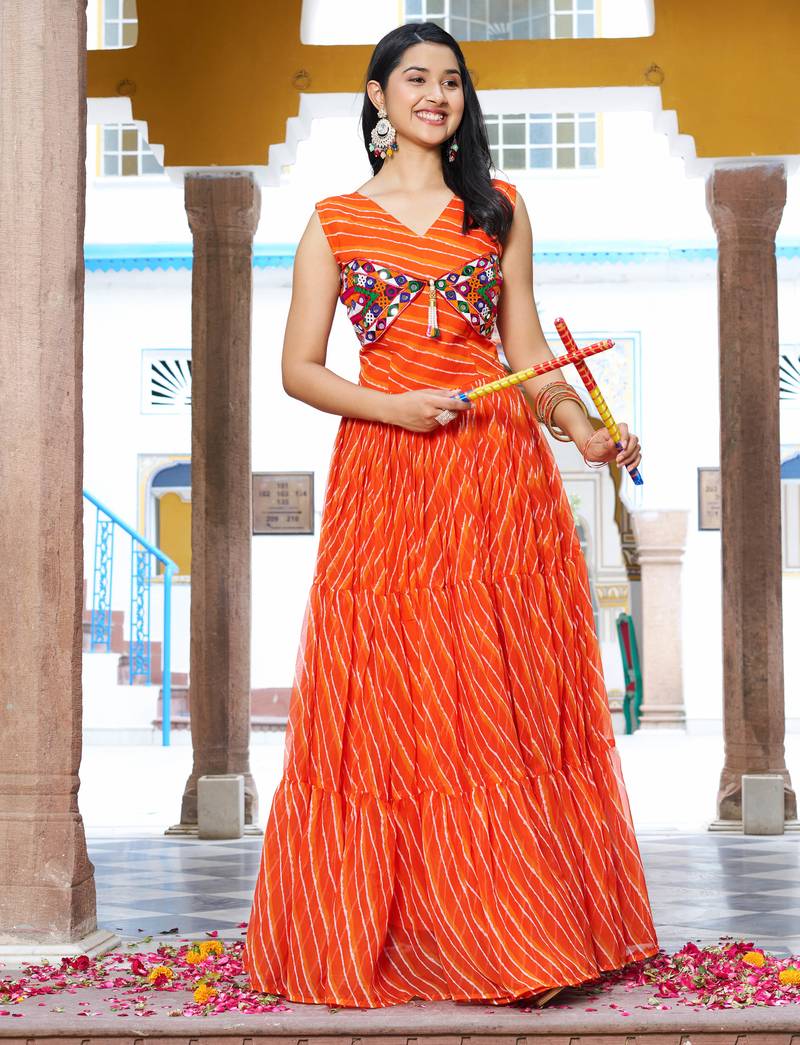 Orange Festive Wear Designer Georgette Bandhani Print With Gamathi Work With Real Mirror Readymade Suit Stitched