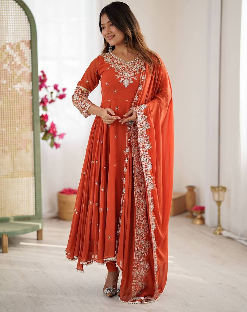 Orange Festive Wear Designer Heavy Blooming Faux Georgette Heavy Embroidery Sequence Moti Work Readymade Suit Stitched