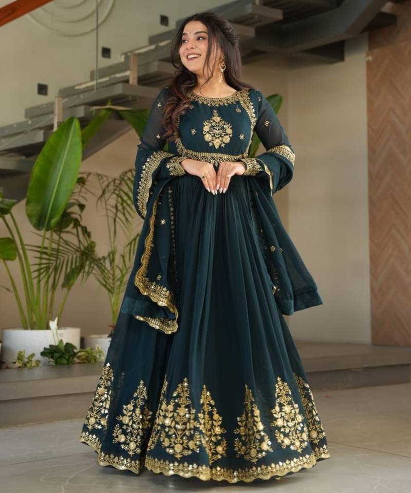 Peacock Green Festive Wear Designer Faux Blooming Georgette Zari Thread & Sequins Embroidery Work Readymade Suit Stitched