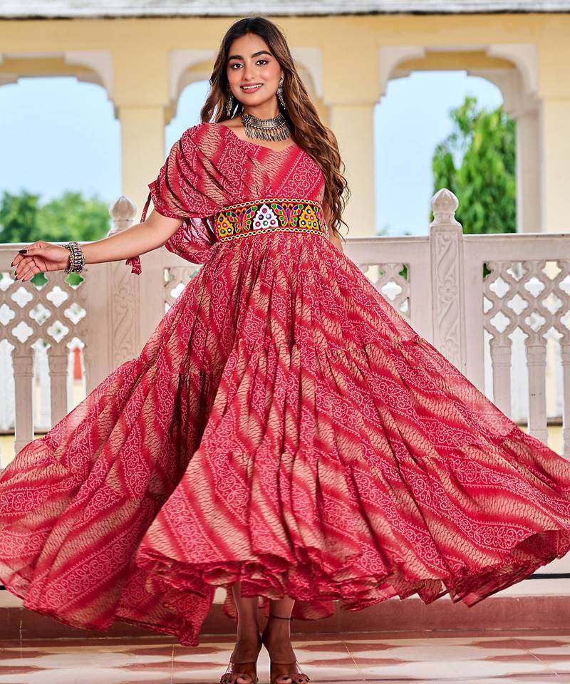 Pink Festive Wear Designer Bandhni Print In Faux Georgette Gamathi Work With Real Mirror Work Readymade Suit Stitched