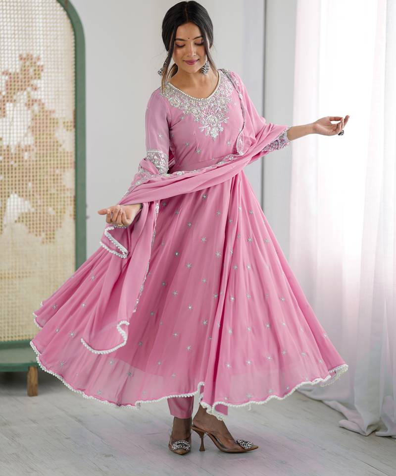 Pink Festive Wear Designer Heavy Blooming Faux Georgette Embroidery Sequence With Moti Work Readymade Suit Stitched