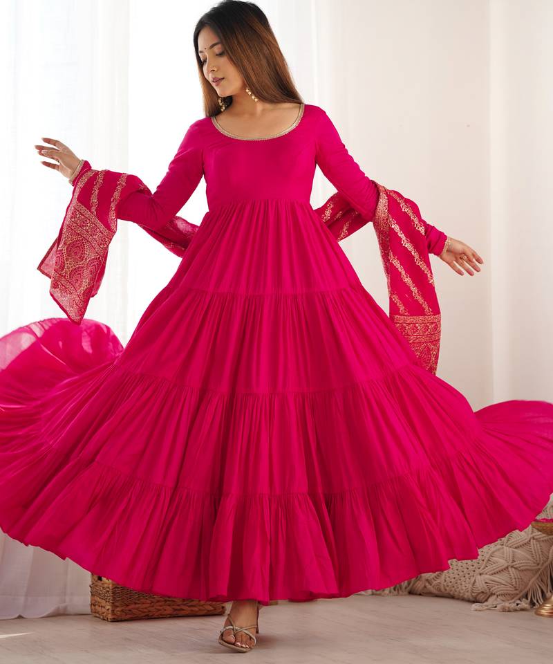 Pink Festive Wear Designer Heavy Pure Roman Silk Chanderi Readymade Suit Stitched