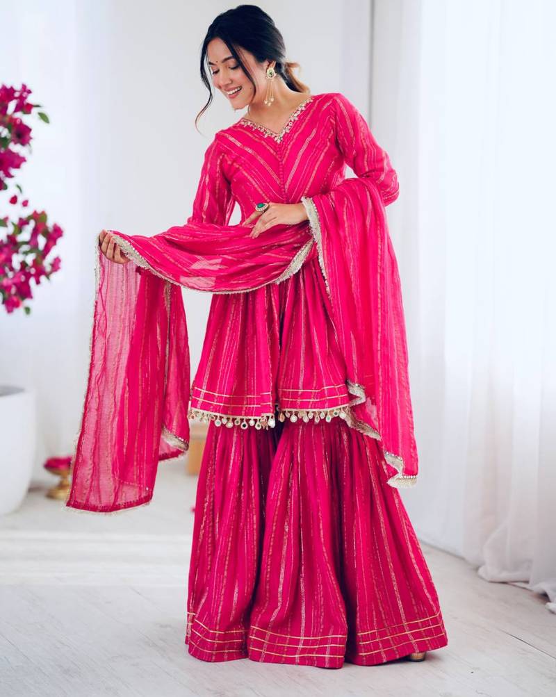• Product Id : 4760453 • Package Details : 1 Top/1 Bottom/1 Dupatta • Type : Readymade Suits For Women • Look : Traditional • Sleeve : Quarter Sleeve • Color : Pink • Fabric : Chanderi Silk • Work : Work • Stitching : Stitched General - Color and Texture may have slight variation. This happens because of photography.