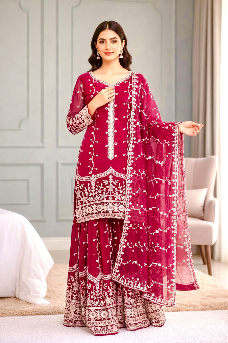 • Product Id : 4760469 • Package Details : 1 Top/1 Bottom/1 Dupatta • Type : Readymade Suits For Women • Look : Traditional • Sleeve : Quarter Sleeve • Fabric : Silk • Color : Pink • Work : Work • Stitching : Stitched General - Color and Texture may have slight variation. This happens because of photography.