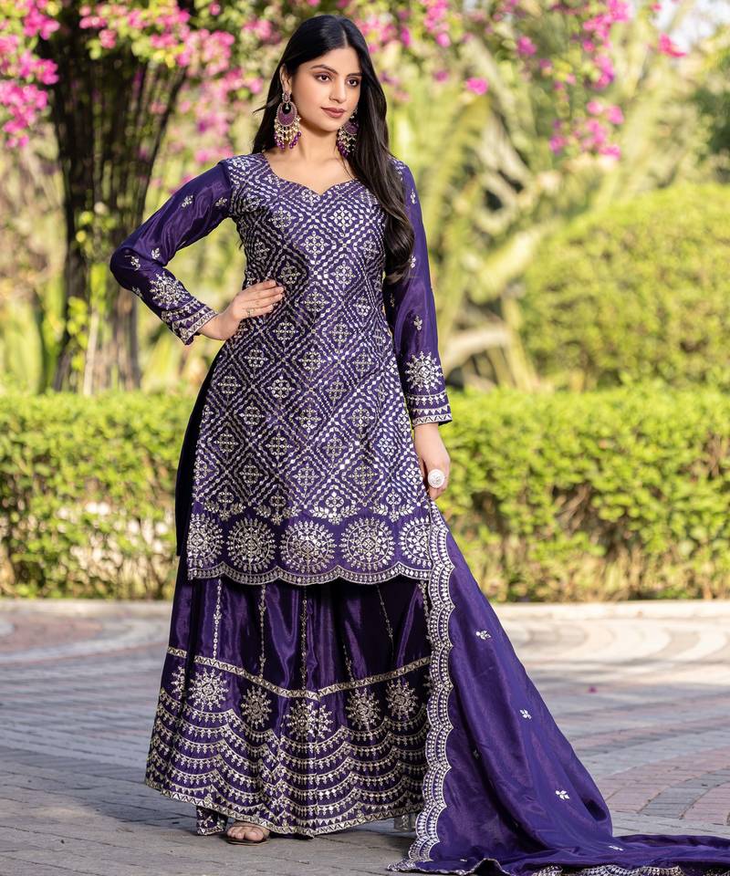• Product Id : 4760236 • Package Details : 1 Top/1 Bottom/1 Dupatta • Type : Readymade Suits For Women • Look : Traditional • Sleeve : Full Sleeve • Color : Purple • Fabric : Fancy Fabric • Work : Work • Stitching : Stitched General - Color and Texture may have slight variation. This happens because of photography.