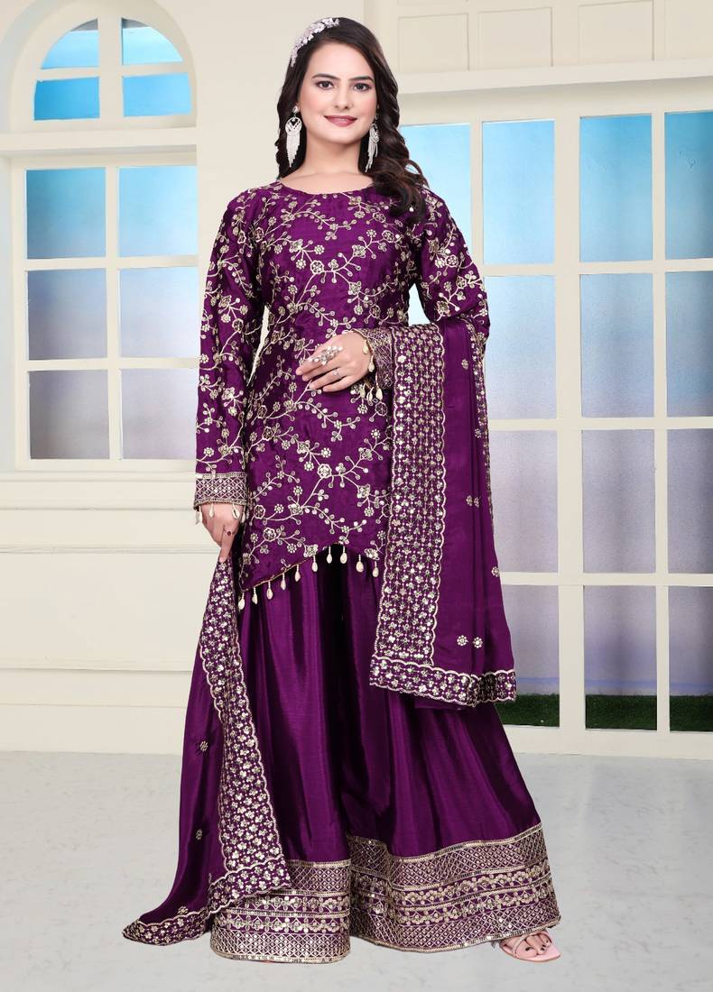 • Product Id : 4760238 • Package Details : 1 Top/1 Bottom/1 Dupatta • Type : Readymade Suits For Women • Look : Traditional • Sleeve : Full Sleeve • Color : Purple • Fabric : Fancy Fabric • Work : Work • Stitching : Stitched General - Color and Texture may have slight variation. This happens because of photography.
