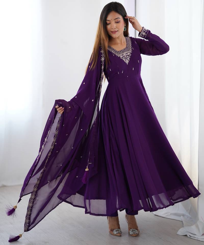 Purple Festive Wear Designer Heavy Pure Soft Fox Georgette Embroidery Zari Work Readymade Suit Stitched