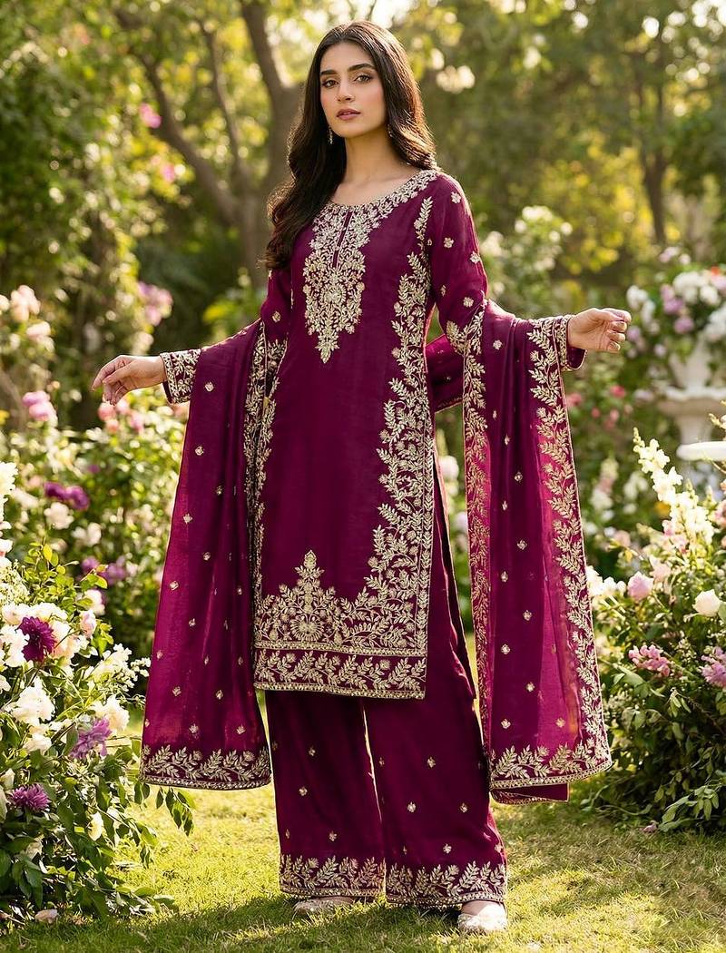 • Product Id : 4760474 • Package Details : 1 Top/1 Bottom/1 Dupatta • Type : Readymade Suits For Women • Look : Traditional • Sleeve : Quarter Sleeve • Fabric : Silk • Color : Purple • Work : Work • Stitching : Stitched General - Color and Texture may have slight variation. This happens because of photography.
