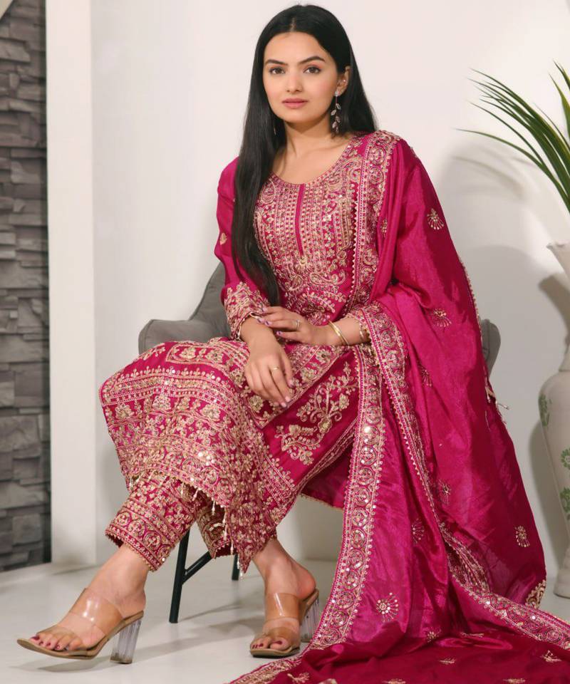 Rani Pink Festive Wear Designer Chinon Heavy Embroidery Sequence Work Readymade Suit Stitched