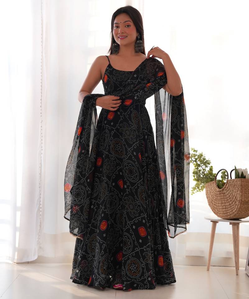 Black Festive Wear Designer Pure Soft Chiffon Bandhej Digital Printed Work Readymade Suit Stitched