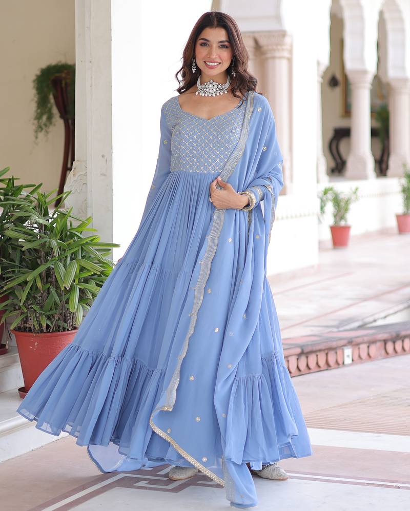 • Product Id : 4760428 • Package Details : 1 Top/1 Dupatta • Type : Readymade Suits For Women • Look : Traditional • Sleeve : Full Sleeve • Color : Sky Blue • Fabric : Faux Georgette • Work : Work • Stitching : Stitched General - Color and Texture may have slight variation. This happens because of photography.