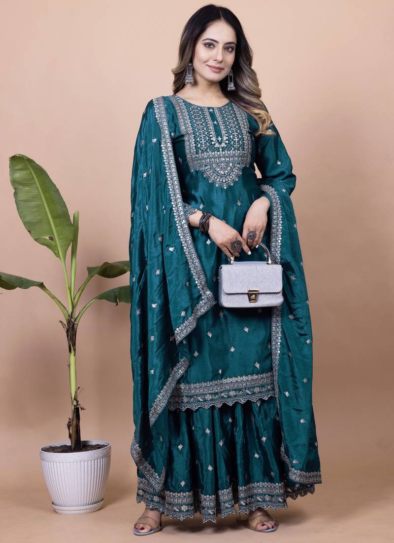 Teal Festive Wear Designer Chinon Readymade Suit Stitched