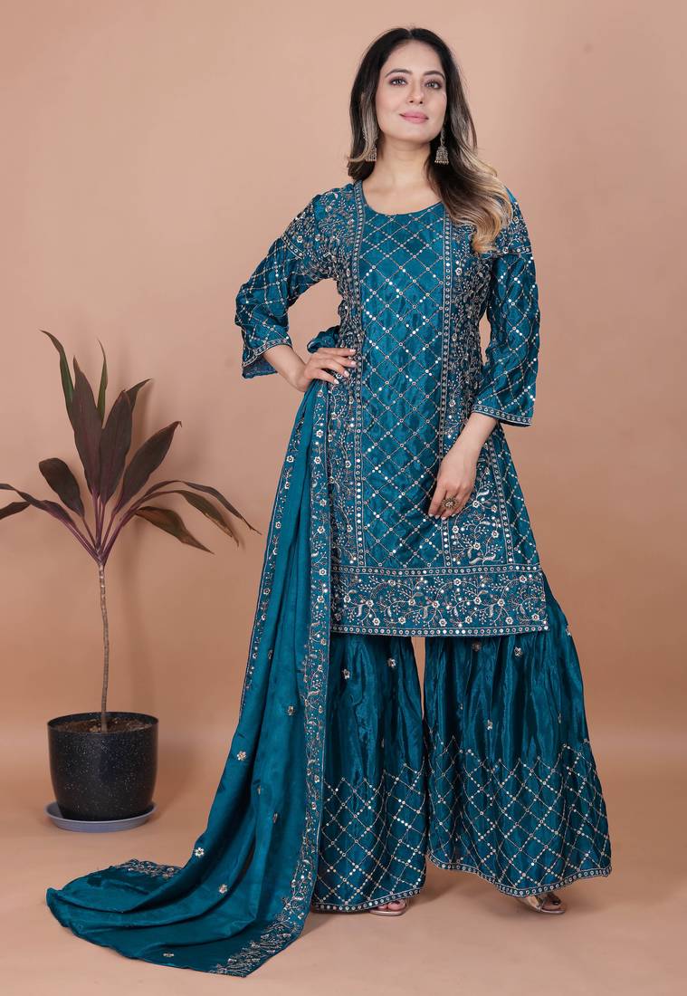 • Product Id : 4760315 • Package Details : 1 Top/1 Bottom/1 Dupatta • Type : Readymade Suits For Women • Look : Traditional • Sleeve : Quarter Sleeve • Color : Teal • Fabric : Fancy Fabric • Work : Work • Stitching : Stitched General - Color and Texture may have slight variation. This happens because of photography.