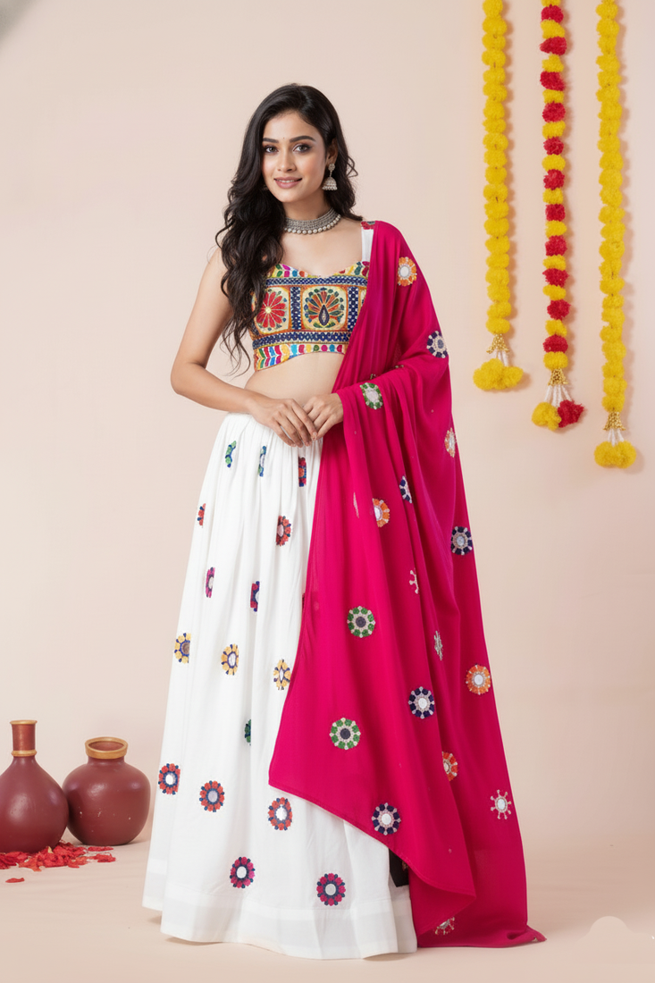 If you find the product for less we'll match it! Know MoreStylish designer Navratri wear lehenga choli, specially crafted for festive celebrations and garba nights.