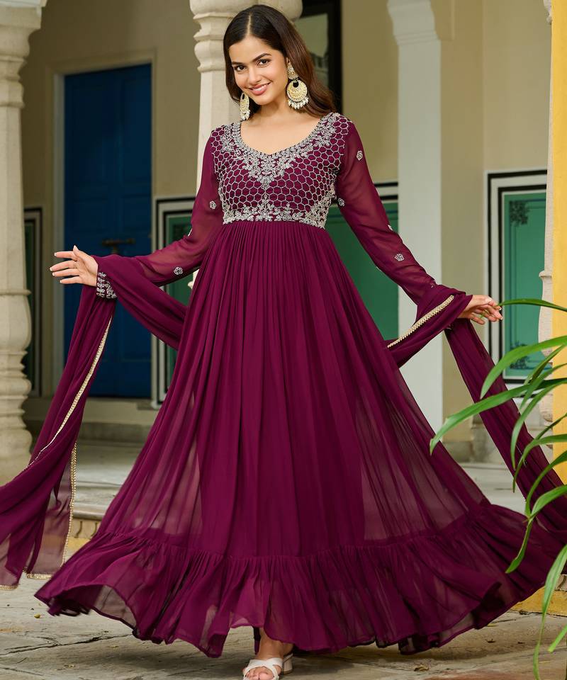 Wine Festive Wear Designer Faux Blooming Georgette Embroidery Work Readymade Suit Stitched