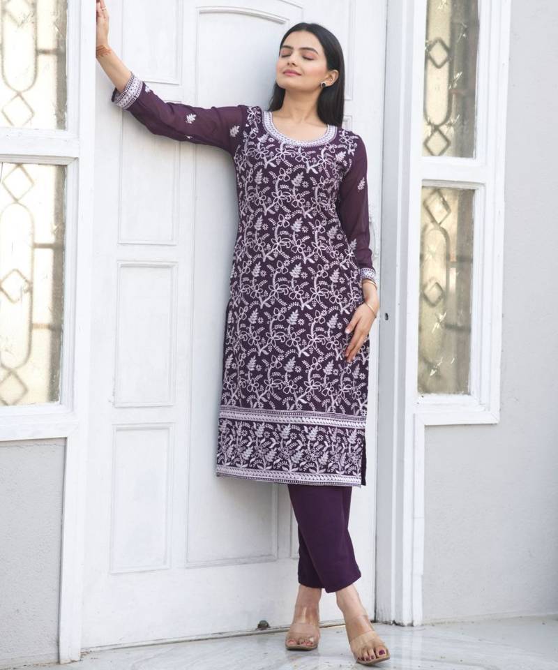 • Product Id : 4760145 • Package Details : 1 Top/1 Bottom • Type : Readymade Suits For Women • Look : Traditional • Sleeve : Quarter Sleeve • Fabric : Georgette • Color : Wine • Work : Work • Stitching : Stitched General - Color and Texture may have slight variation. This happens because of photography.