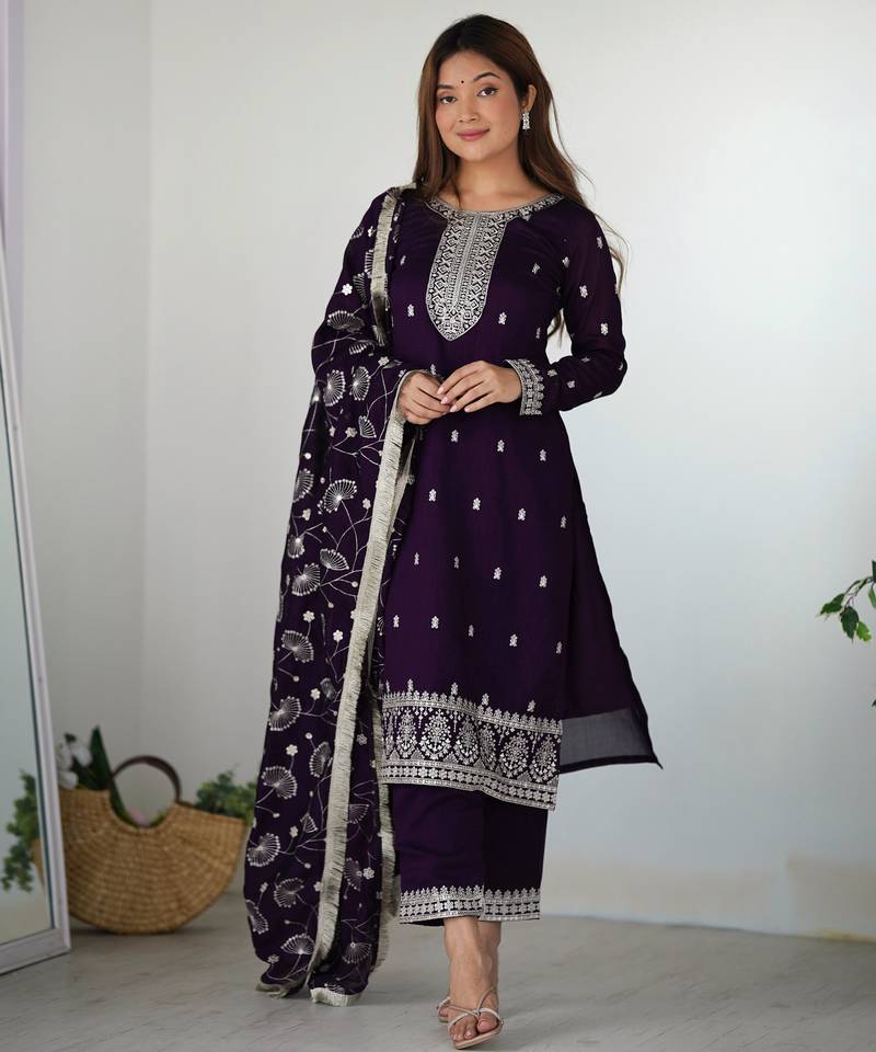 • Product Id : 4760247 • Package Details : 1 Top/1 Bottom/1 Dupatta • Type : Readymade Suits For Women • Look : Traditional • Sleeve : Full Sleeve • Fabric : Silk • Color : Wine • Work : Work • Stitching : Stitched General - Color and Texture may have slight variation. This happens because of photography.