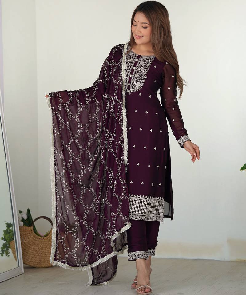 • Product Id : 4760140 • Package Details : 1 Top/1 Bottom/1 Dupatta • Type : Readymade Suits For Women • Look : Traditional • Sleeve : Full Sleeve • Fabric : Silk • Color : Wine • Work : Work • Stitching : Stitched General - Color and Texture may have slight variation. This happens because of photography.