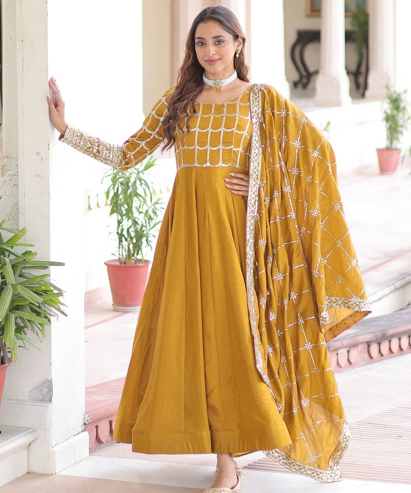 • Product Id : 4760462 • Package Details : 1 Top/1 Dupatta • Type : Readymade Suits For Women • Look : Traditional • Sleeve : Quarter Sleeve • Color : Yellow • Fabric : Fancy Fabric • Work : Work • Stitching : Stitched General - Color and Texture may have slight variation. This happens because of photography.
