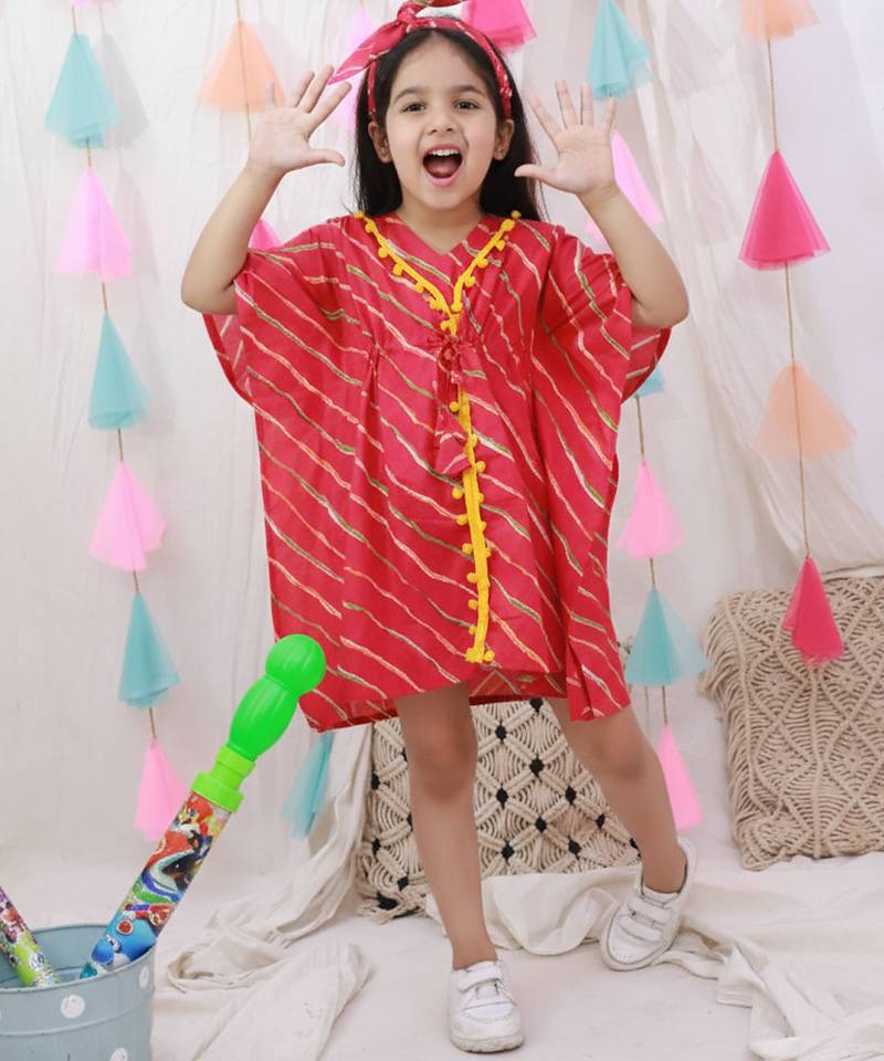 • Product Id : 4720868 • Package Details : 1 Dress / 1 Hairband • Type : Kids Kaftans • Work : Woven • Sleeve : Half Sleeve • Neck Style : V Neck • Top Color : Red • Top Fabric : Cotton • Stitching : Stitched • Gender : Girl Payments [+]