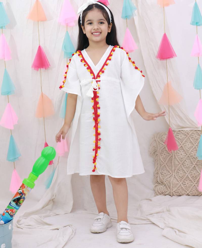 • Product Id : 4720869 • Package Details : 1 Dress / 1 Hairband • Type : Kids Kaftans • Work : Plain • Sleeve : Half Sleeve • Neck Style : V Neck • Top Color : White • Top Fabric : Cotton • Stitching : Stitched • Gender : Girl Payments [+]