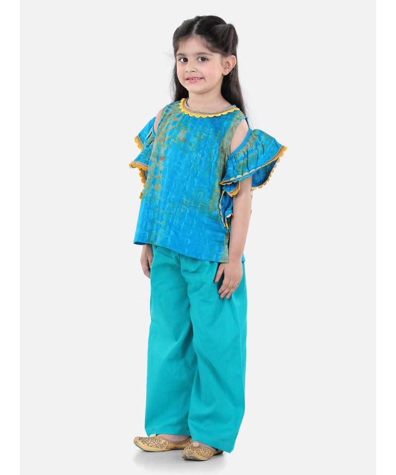 • Product Id : 3759001 • Package Details : 1 Top / 1 Pant • Type : Girls Tops & Bottoms • Occasion : Casual • Work : Plain • Look : Fashion • Sleeve : Short Sleeve • Top Color : Blue • Top Fabric : Silk,Silk Blend • Stitching : Stitched • Gender : Girl Payments [+]