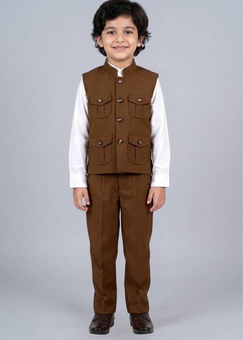 Boys Coffee Brown Lycra Solid 3 Piece Waistcoat Set With Classic Flap Pockets