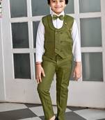 Boys Cotton Full Sleeves Solid 3 Piece Party Suit Set With Bow Mehandi
