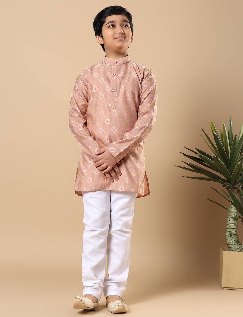 Boys Peach Cotton Blend Ikat Woven Pattern Kurta & Pyjama Set