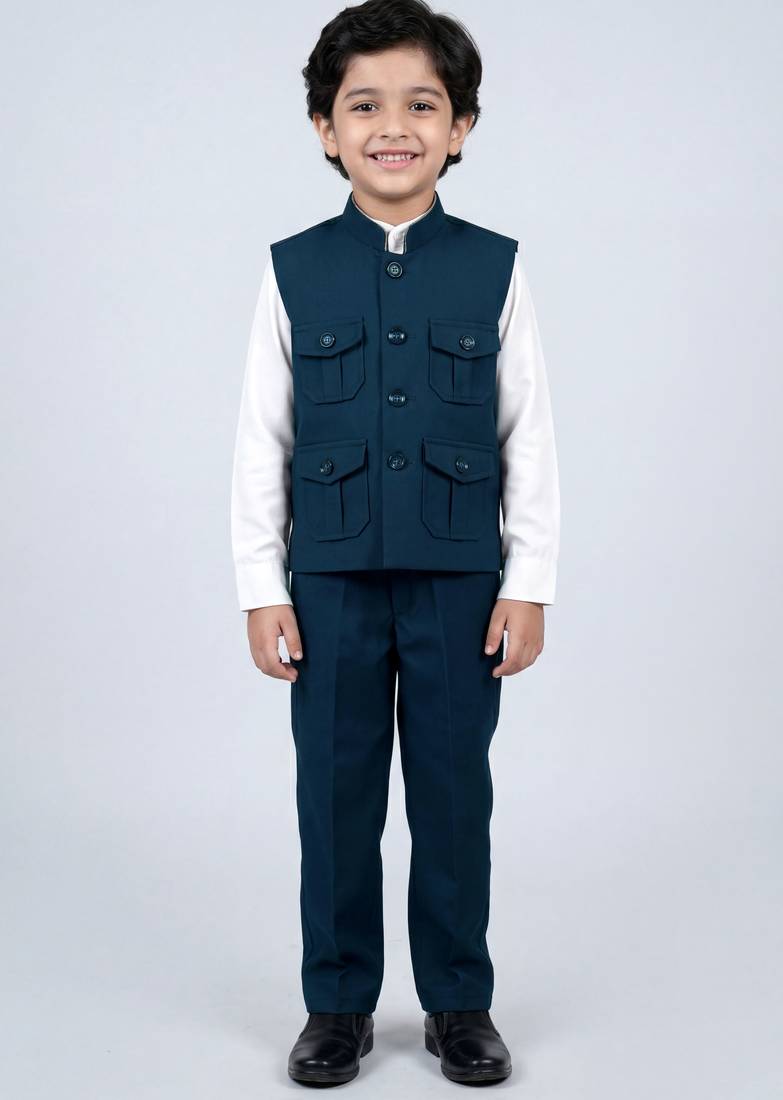 If you find the product for less we'll match it! Know MoreUpgrade your boy’s formal wardrobe with this stylish 3-Piece Suit Set, designed for a smart and polished look. Crafted from comfortable lycra fabric, this set ensures flexibility and ease of movement while maintaining a structured fit. The waistcoat features a classic mandarin collar, front button closure, and four neatly designed flap pockets that add a refined touch. Paired with a matching shirt and trousers, this outfit is perfect for weddings, festive occasions, parties, and special events. Its solid design offers a timeless appeal, making it a versatile addition to any little gentleman’s collection.