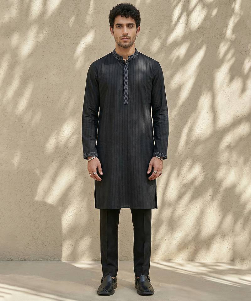 This Black Embroidered Cotton Silk Kurta Set Exudes Timeless Elegance And Refined Craftsmanship. Made From A Luxurious Cotton-Silk Blend, The Kurta Features Intricate Embroidery That Adds A Sophisticated Touch. Perfect For Weddings, Festive Occasions, Or Formal Gatherings, It Pairs Effortlessly With Matching Bottoms For A Polished And Stylish Ensemble.