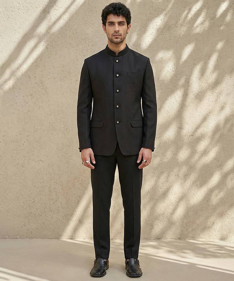 This Black Woven Jacquard Bandhgala Set Exudes Regal Sophistication And Refined Style. Crafted From Premium Jacquard Fabric, The Jacket Features An Intricate Woven Pattern That Adds Depth And Elegance, Paired With Matching Trousers For A Complete Ensemble. Perfect For Weddings, Formal Events, Or Festive Occasions, It Offers A Distinguished, Polished Look.
