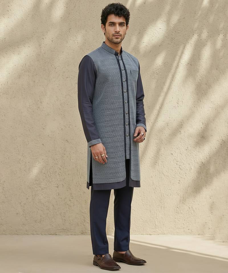 This Blue Woven Cotton Silk Kurta Set Perfectly Blends Elegance And Comfort. Crafted From A Premium Cotton-Silk Blend, It Features A Subtle Woven Texture That Adds Depth And Sophistication. Ideal For Festive Occasions, Weddings, Or Formal Gatherings, It Pairs Effortlessly With Matching Bottoms For A Refined, Stylish Ensemble.