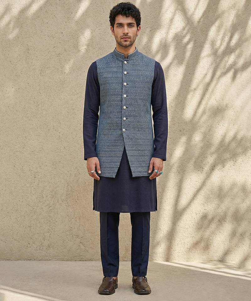 This Blue Woven Cotton Silk Sherwani Blends Traditional Charm With Contemporary Elegance. Crafted From A Soft Cotton-Silk Blend, It Features A Subtle Woven Texture And Structured Silhouette, Perfect For Weddings Or Festive Occasions. Pair It With Matching Churidar Or Trousers For A Sophisticated, Regal Look That Stands Out With Grace.