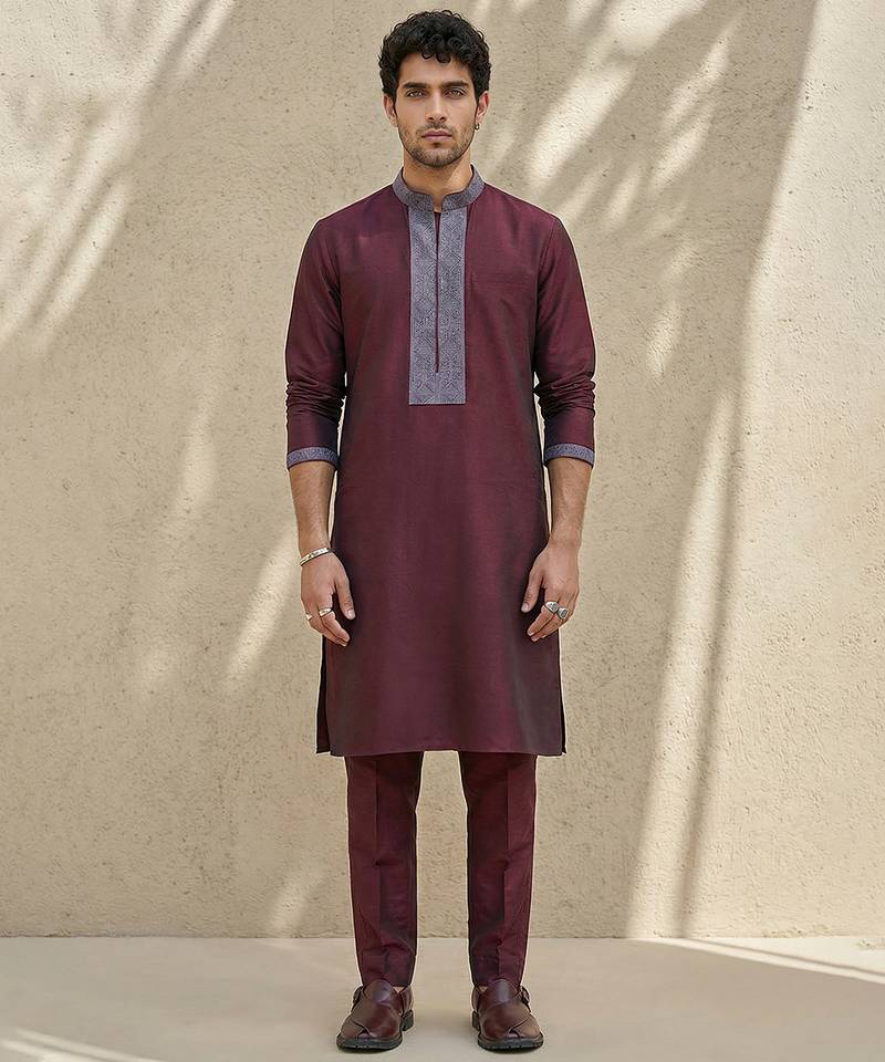 This Maroon Embroidered Cotton Silk Kurta Set Exudes Rich Elegance And Refined Craftsmanship. Made From A Luxurious Cotton-Silk Blend, The Kurta Features Intricate Embroidery That Adds A Regal Touch. Perfect For Weddings, Festive Occasions, Or Formal Gatherings, It Pairs Seamlessly With Matching Bottoms For A Sophisticated And Stylish Ensemble.